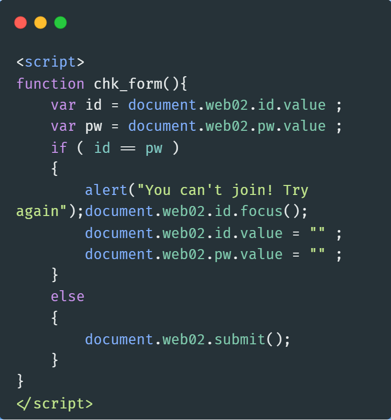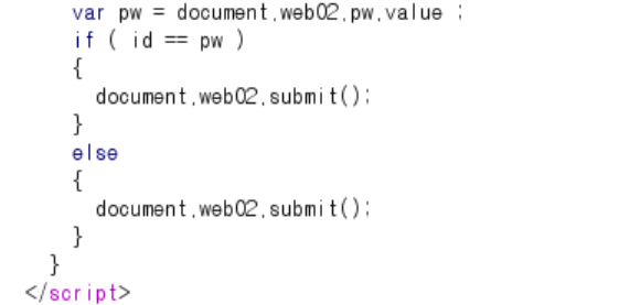 var id = document.web02.id.value;와 var pw = document.web02.pw.value;는 웹 폼의 id와 pw 필드 값을 변수에 저장