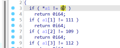 첫 번째 if문 조건을 보면 *a1이 67과 일치하는지 확인하는 것이 보입니다. 여기서 숫자는 아스키 코드로 표현한 것입니다.
