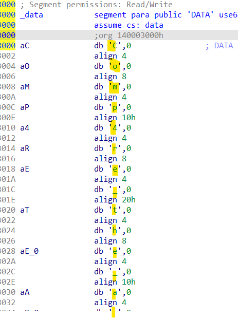 aC배열을 확인해보면 제가 노란색으로 칠해놓은 부분 처럼 문자가 하나씩 나와있는데(아래에 더 있음)