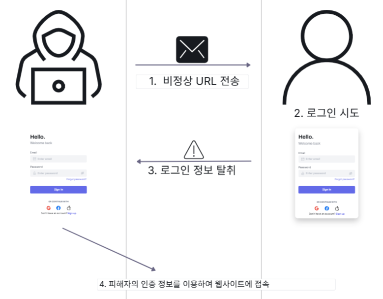 - 공격자는 사용자들이 자주 사용하는 서비스(은행, SNS 등)의 로그인 페이지를 그대로 복제하여 가짜 웹사이트를 제작합니다.