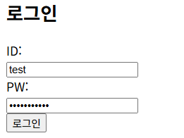 - ID와 비밀번호 입력창에 각각 test, qhdksxptmxm를 입력하고 '로그인' 버튼을 클릭합니다. 페이지에는 아무런 변화가 없지만, 정보는 이미 서버로 전송되었습니다.