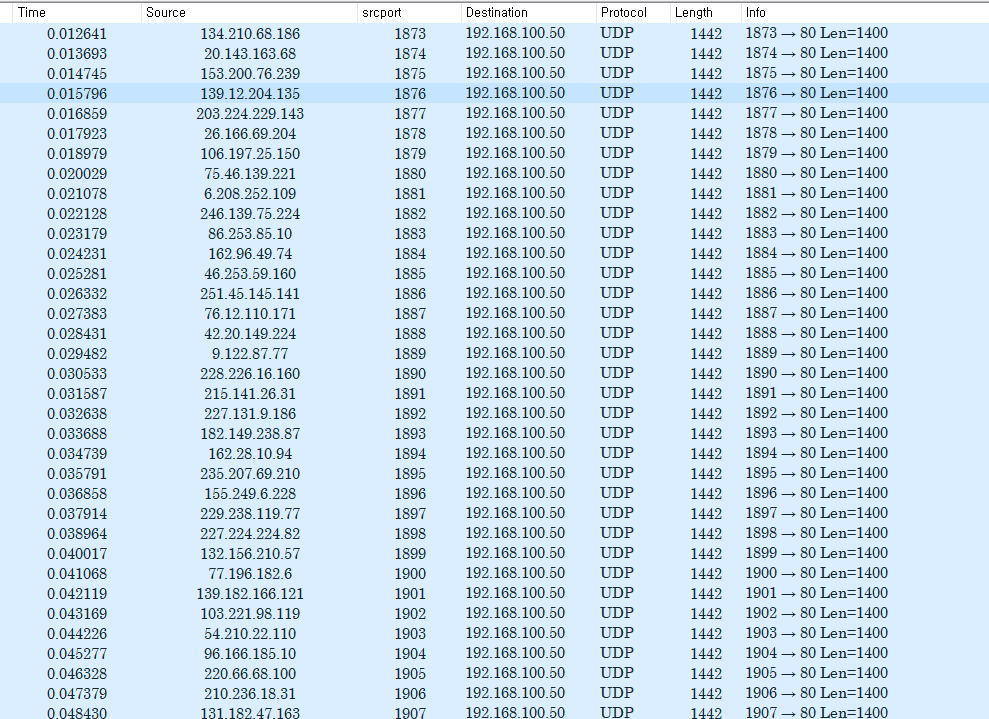 패킷의 크기를 의도적으로 크게 만들기 위함을 예측할 수 있다. 또한 출발지 IP가 무작위 숫자로 되어있는 것으로