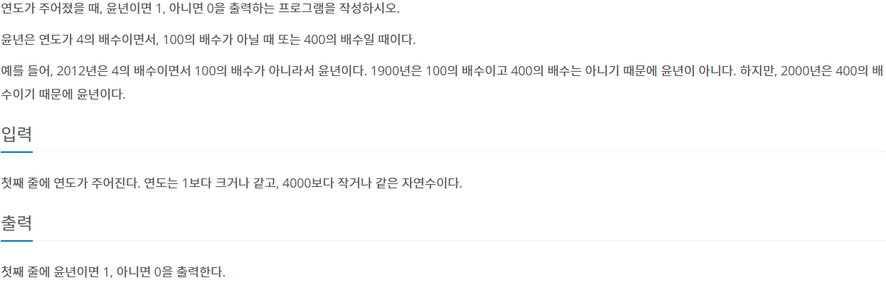 - 문제 요약: 연도를 입력받아 윤년이면 1, 아니면 0을 출력하는 문제입니다