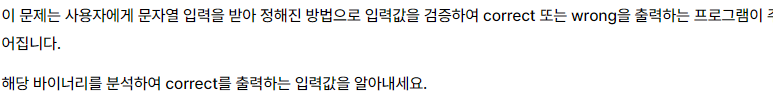 사용자로부터 입력을 요청하는데 형식지정자인 %256을 사용하여 최대 256자의 문자를 받고, 입력이 올바를 때는correct, 입력이 잘못되었을때는 wrong을 출력하는 느낌입니다.