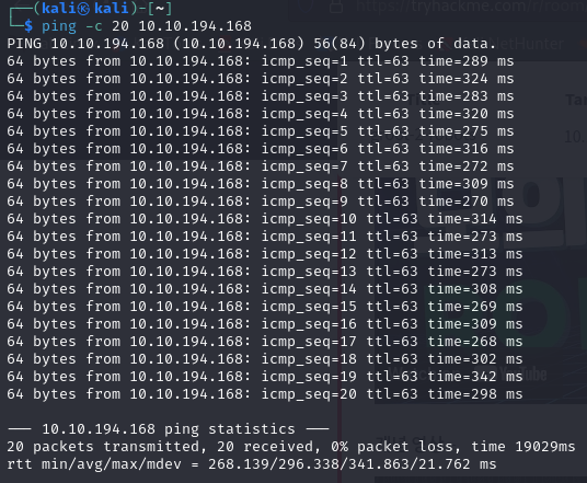 ICMP 패킷을 20번 보내보고 네트워크 상에서 접근 가능한지 확인해보니 접근 가능할 것 같다.