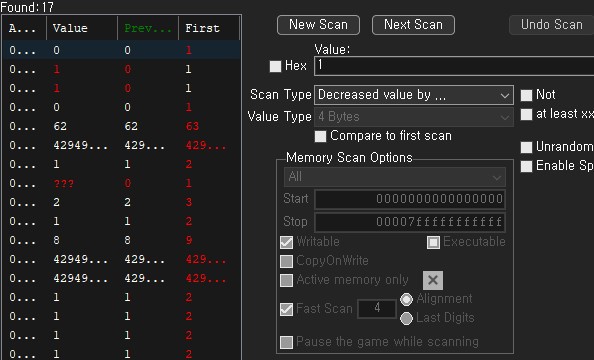 1만큼 감소한 변수를 찾기 위해 Decreased value by로 설정하고 1로 설정하고 스캔 합니다.