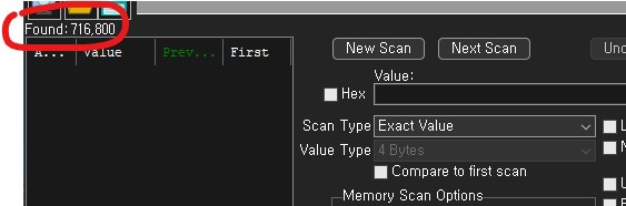 Because you don't know the value it is right now, exact value wont do any good, so choose as scantype 'Unknown initial value', again, the value type is 4-bytes. (Most windows apps use 4-bytes.) Click First scan and wait till it's done.